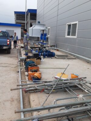 - Lắp đặt hệ thống đường ống và bơm nước: Bắt đầu từ việc xây dựng hệ thống đường ống dẫn nước từ nguồn cung cấp đến tháp giải nhiệt. Hệ thống đường ống bao gồm các bộ phận như bơm nước, van, bộ lọc và đường ống dẫn nước.